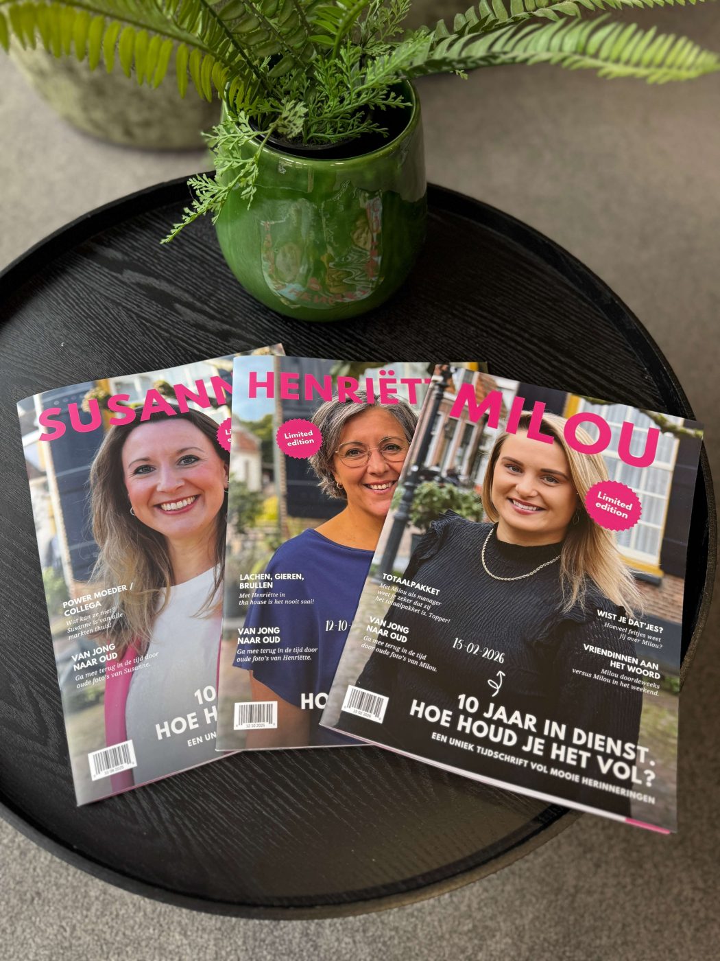 Voor BergWerk ontwierp ik drie persoonlijke jubileumtijdschriften ter ere van drie werknemers die binnen een periode van vijf maanden allemaal hun 10-jarig dienstverband vierden. Elk tijdschrift werd volledig op maat gemaakt voor één persoon en diende als blijvend, tastbaar cadeau.